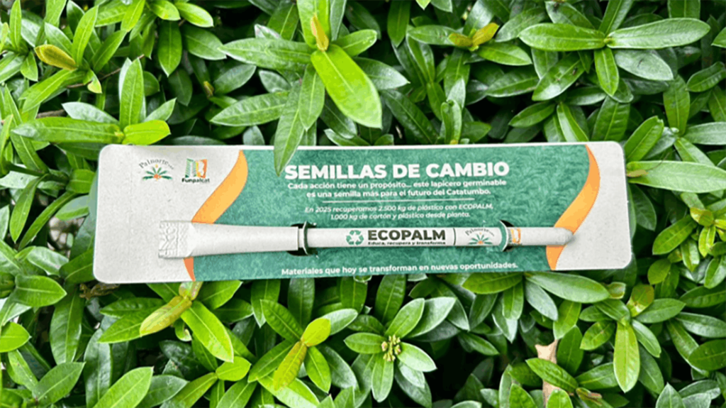 Estos lapiceros fueron elaborados gracias a los recursos obtenidos por la venta de los últimos materiales plásticos del proyecto Ecopalm, liderado por nuestra fundación Funpalcat, así como por el aprovechamiento de otros residuos recolectados, separados y gestionados adecuadamente en planta, entre ellos cartón, hojas, botas de caucho, tapas de botellones y plásticos.